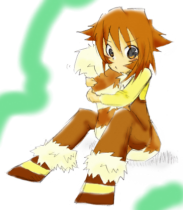 んで本題、テーマカラーは茶色、目の色はオレンジ、髪の色は微妙に明るい茶色、特徴は耳っぽくはねた髪の毛と首元と足のもふもふと尻尾ですw